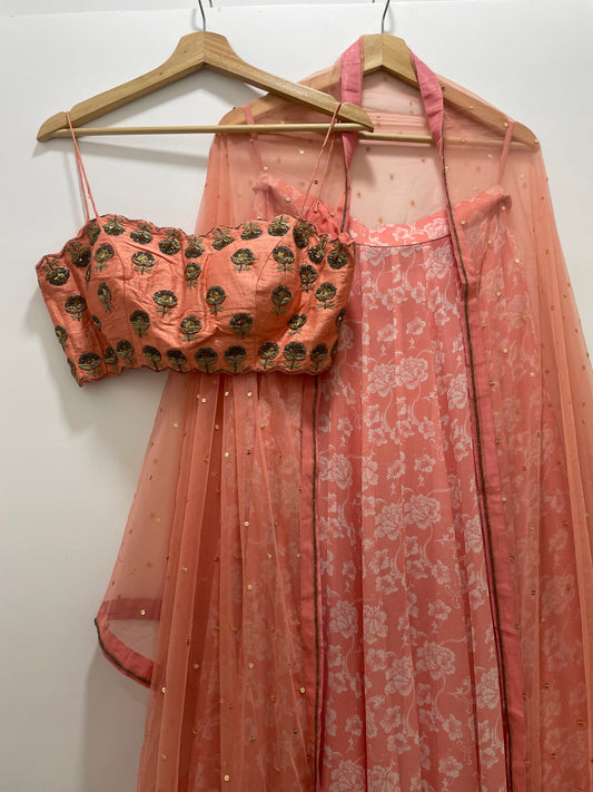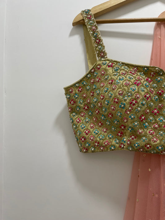 Baby pink hand embroidered strappy blouse and dupatta with a high waisted floral printed lehenga