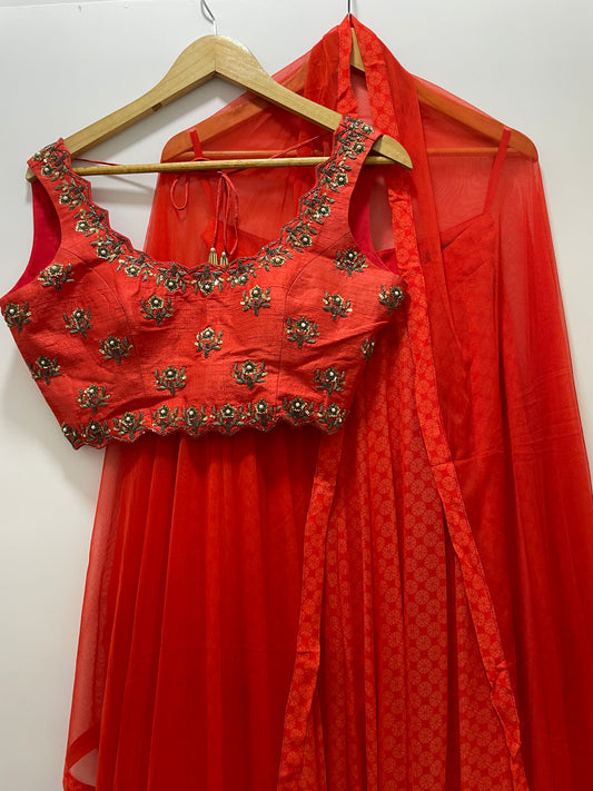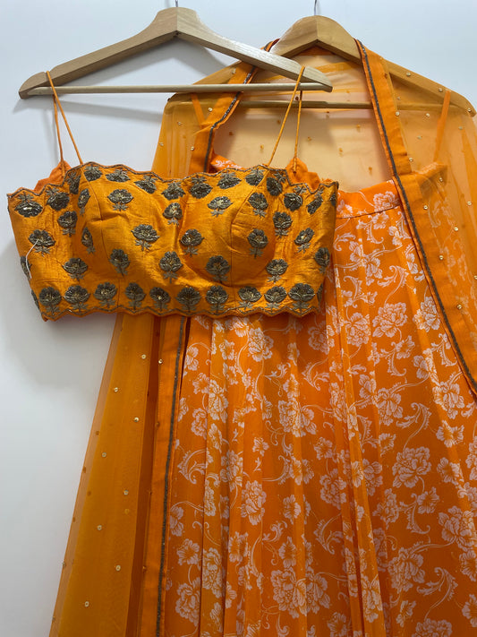 Hand embroidered orange blouse and dupatta with a high waisted floral printed lehenga