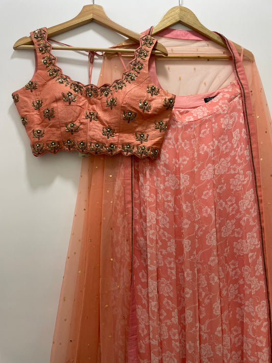 Baby pink hand embroidered blouse and dupatta with a high waisted floral printed lehenga