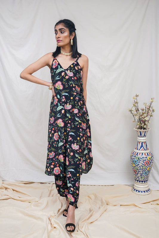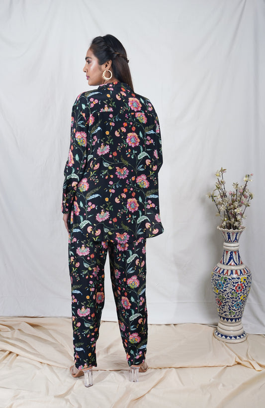 Black floral printed high low shirt and pants