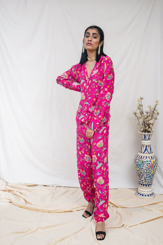 Hot pink floral printed high low shirt and pants