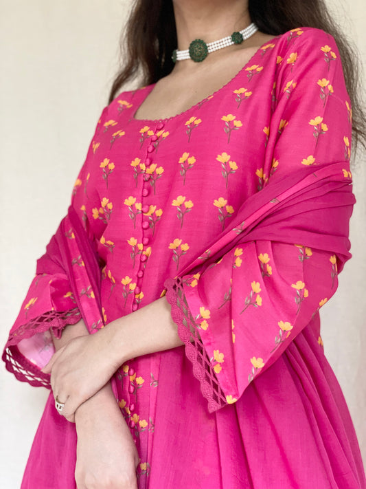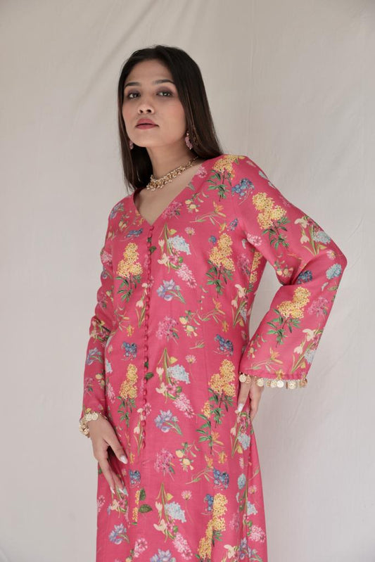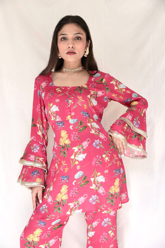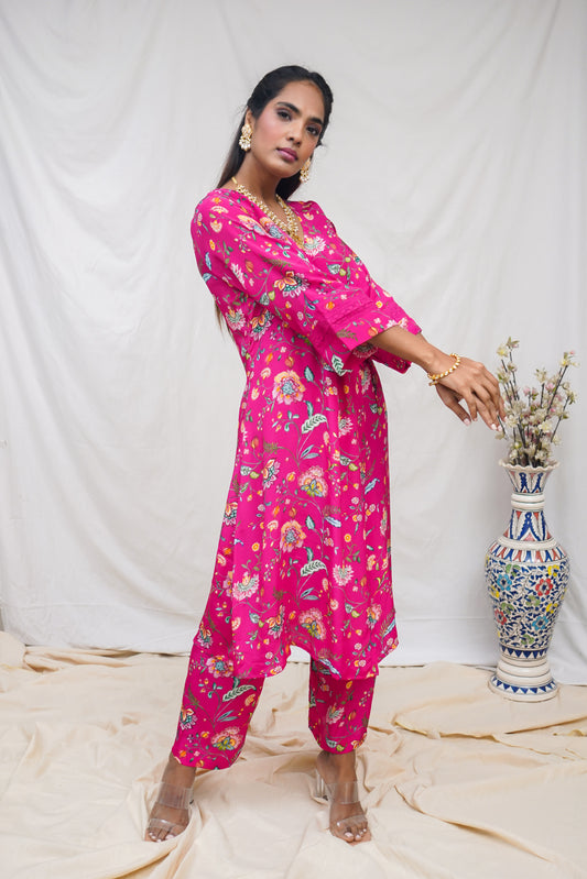 Hot pink floral printed wrap kurta set