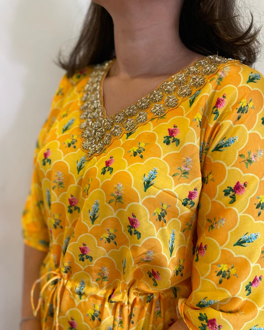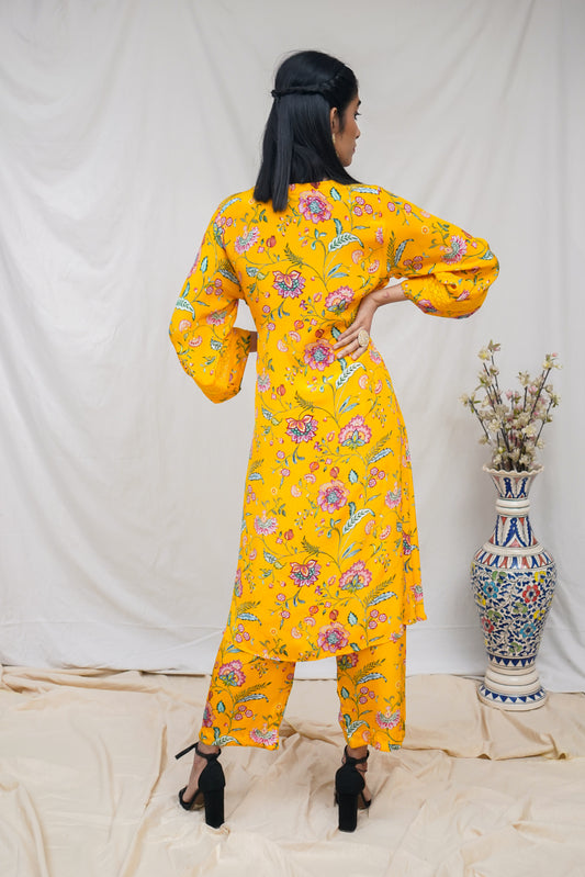 Yellow floral printed wrap kurta set