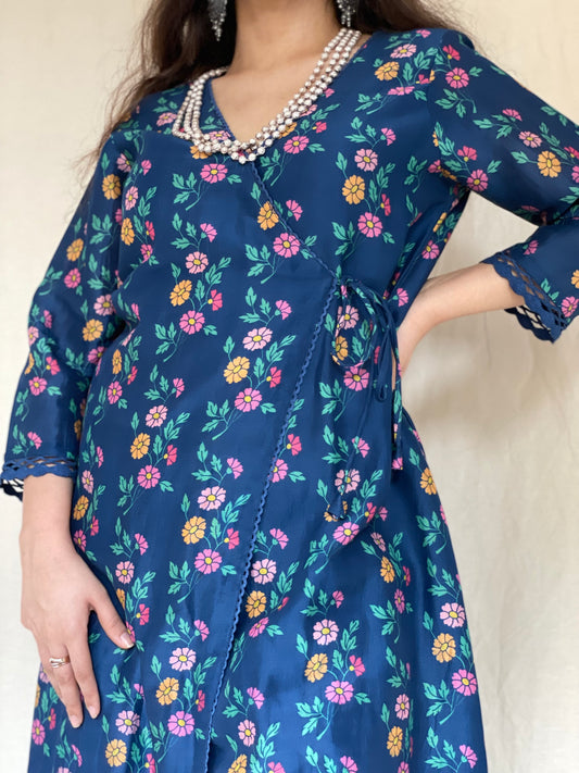 Navy blue floral printed kurta, pyjama and dupatta