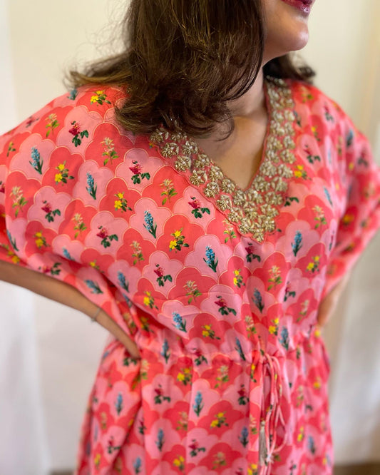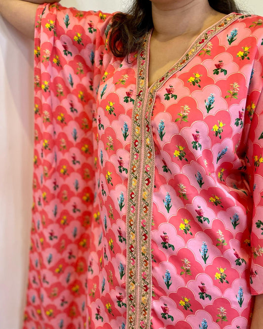 Pink floral printed kaftan with a hand embroidered neckline