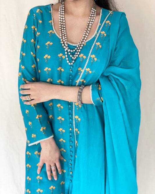 Peacock blue floral printed kurta, pyjama and dupatta with pearl edging