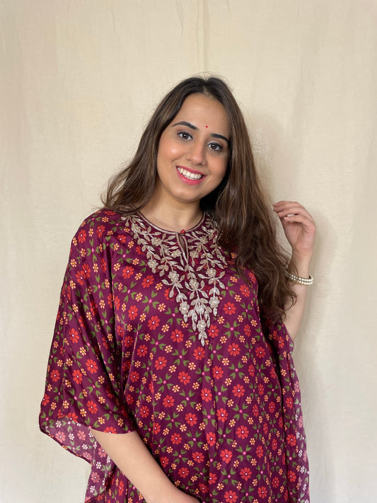 Wine red floral printed kaftan with a hand embroidered yoke and pyjama