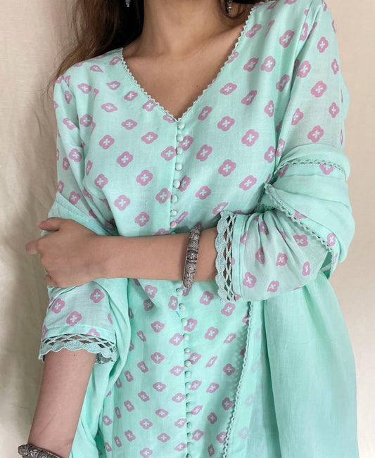 Aqua geometric floral kurta, pyjama and dupatta