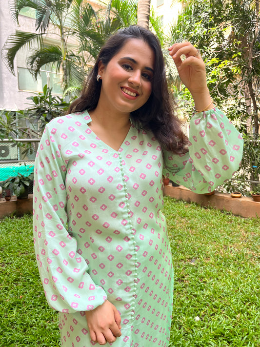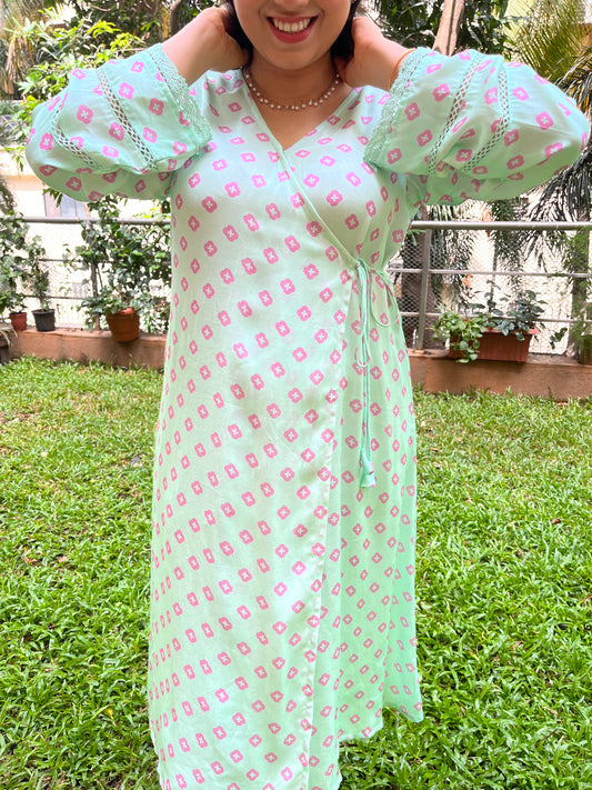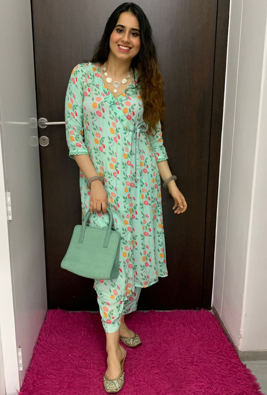 Geometric floral aqua wrap kurta pyjama set with lace detailing