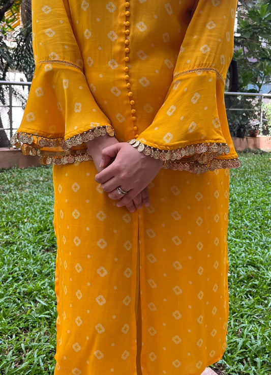 Geometric floral yellow kurta and pyjama set with gold coin detailing