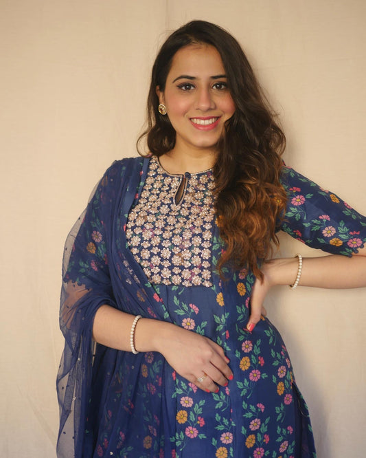 Navy blue floral printed kurta with a hand embroidered yoke, pyjama and dupatta