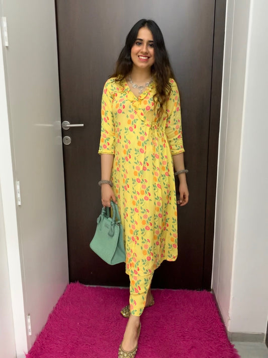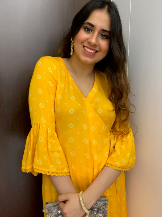 Sunny yellow floral and polka dot printed wrap around kurta and pyjama