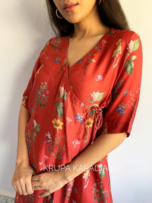 Hot pink floral and polka dot printed wrap around kurta and pyjama