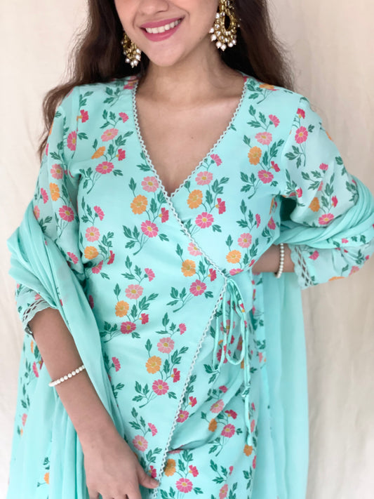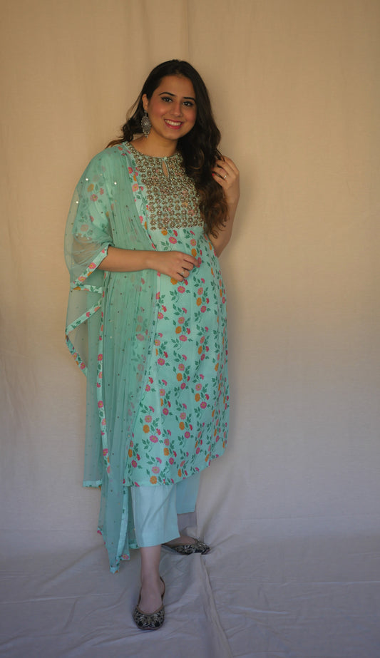 Aqua floral printed kurta with a hand embroidered yoke, pyjama and dupatta