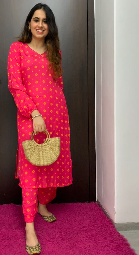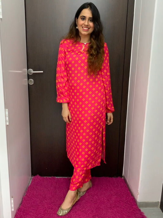 Hot pink floral and polka dot printed V neck kurta and pyjama set