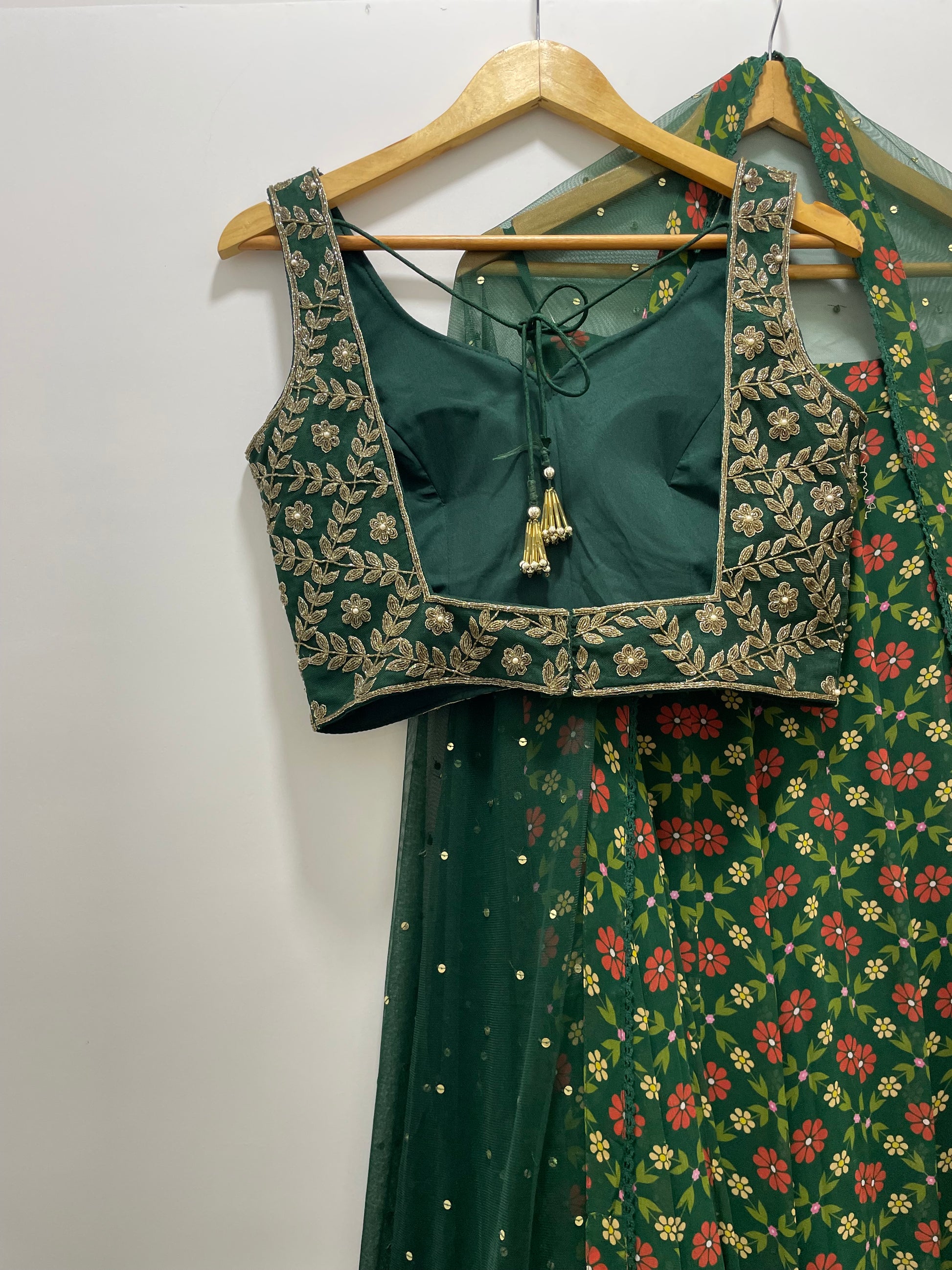 Bottle green hand embroidered gold blouse and dupatta with a high waisted floral printed lehenga